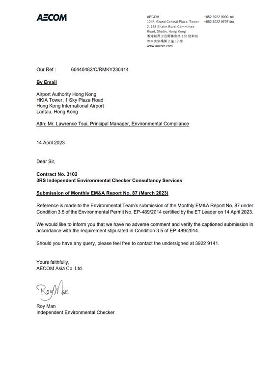 With reference to Appendix E of the Manual, it is noted that the key assumptions adopted in approved EIA report for the construction phase are still valid and no major changes are involved. The environmental mitigation measures recommended in the approved EIA Report remain applicable and shall be implemented in undertaking construction works for the Project.