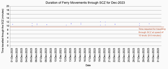 The average speed of all HSFs travelling through the SCZ ranged from 11.2 to 13.4 knots. All HSFs had travelled through the SCZ with average speed under 15 knots in compliance with the SkyPier Plan. The time used by HSFs to travel through SCZ is presented in Figure 7.1. |