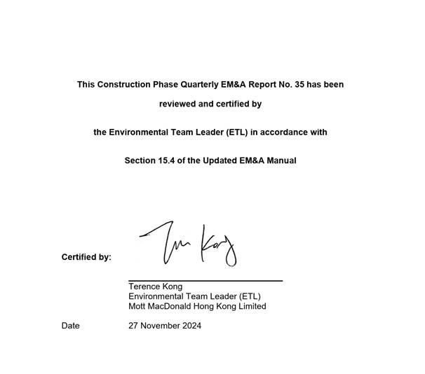In the third quarter of 2024, the EM&A programme has been implemented as planned, including 96 sets of air quality measurements, 54 sets of construction noise measurements, 6 complete sets of vessel line transect surveys for post-construction phase CWD monitoring, as well as environmental site inspections and waste monitoring for the Project’s construction works.
