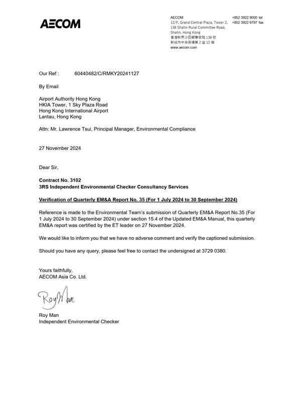 The Supplementary CAP was submitted to EPD pursuant to EP Condition 2.20. The CARs for Golf Course and T2 Emergency Power Supply Systems (EPSS) were submitted to EPD in accordance with EP Condition 1.9 and the Supplementary CAP, in which no land contamination issues were identified. EPD has issued no further comment for aforesaid CARs. No leakage was found after the removal of underground fuel pipelines and all required additional photos were submitted to EPD.