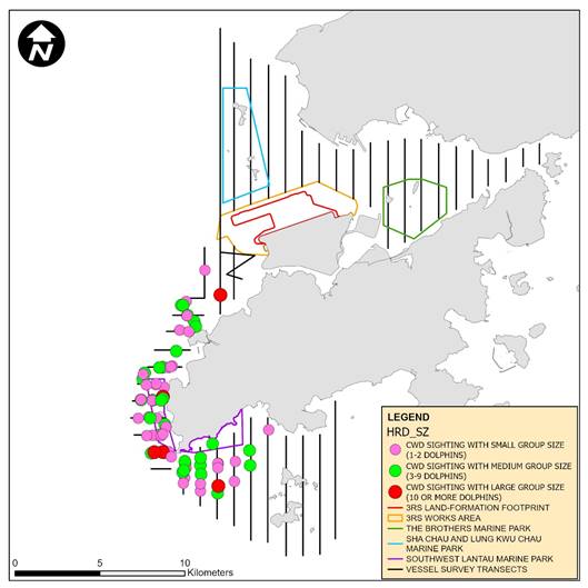 Post-construction phase CWD monitoring by vessel line transect survey were conducted following the same methodology as adopted in construction phase monitoring. A total of around 1,325 km of survey effort was collected from these surveys during the reporting period, with around 96.8% of the total survey effort being conducted under favourable weather condition (i.e. Beaufort Sea State 3 or below with favourable visibility) and a total of 72 sightings and with 258 dolphins were recorded during on-effort searches under such favourable weather condition.
