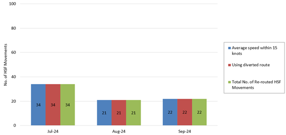 The average speed of the HSF travelling through the Speed Control Zone (SCZ) ranged from 10.7 to 14.0 knots. All HSFs travelled through the SCZ with average speed within 15 knots, used diverted route and entered / left SCZ through gate access points in compliance with the SkyPier Plan. The summary of the SkyPier Plan monitoring result is presented in Graph 1.