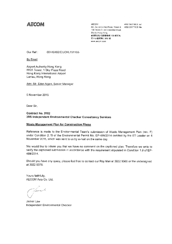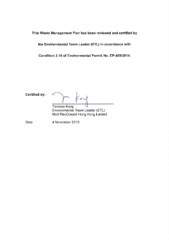 Under the Environmental Impact Assessment Ordinance, the Environmental Impact Assessment (EIA) Report and the Environmental Monitoring and Audit (EM&A) Manual (Register No.: AEIAR-185/2014) prepared for the “Expansion of Hong Kong International Airport into a Three-Runway System” (the project) have been approved by the Environmental Protection Department (EPD), and an Environmental Permit (EP) (Permit No.: EP-489/2014) has been issued for the project. Pursuant to Condition 2.19 of the Environmental Permit (EP), the Airport Authority Hong Kong (AAHK) should prepare a Waste Management Plan for waste generated from construction activities of the project.