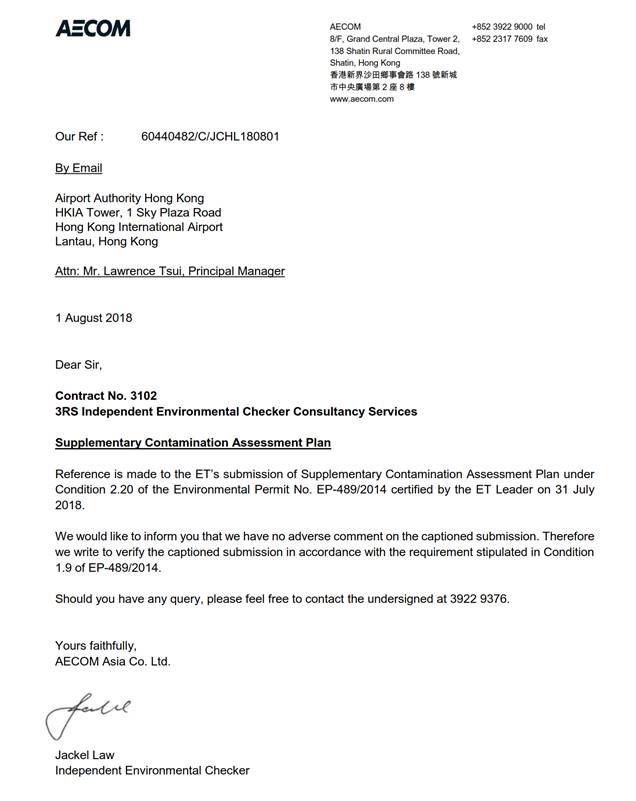 SI work at airside petrol filling station, fuel tank room to the west of CAD antenna farm and fire service facility (Refer to Table 4.2) have not been commenced. After the captioned SI works have been completed, a corresponding Contamination Assessment Report (CAR) which documents the detailed methodology of SI, assessment criteria, on-site observations and the analytical results from the SI works will be submitted to EPD for endorsement.