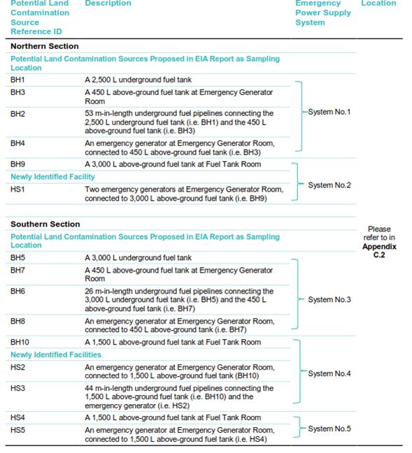 According to Sections 11.5.4.14 and 11.5.4.37 of the EIA Report, it is anticipated that any potential land contamination concern related to possible leakage/ spillage of fuel in the fuel tank room within T2 building and fuel tank room to the west of CAD antenna farm will not cause any insurmountable impact. Furthermore, as mentioned in Sections 11.5.4.38, 11.5.4.47 and 11.5.4.50 of the EIA Report, the seawater pump house, switching station, pumping station and fire training facility are not identified as potential contaminative land use types as given in Table 2.3 of the Practice Guide for Investigation and Remediation of Contaminated Land, hence no potential land contamination along these areas are anticipated.