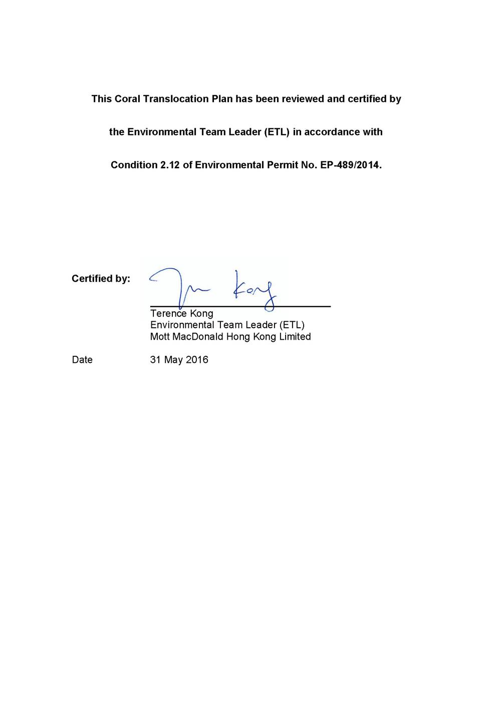 This Plan has been prepared to present the findings of baseline coral dive survey and to detail the coral translocation proposal including translocation methodology and procedure, potential recipient area, translocation schedule and follow-up monitoring, to fulfil the EP requirement. The Agriculture, Fisheries and Conservation Department (AFCD) have been consulted in preparing this Plan.