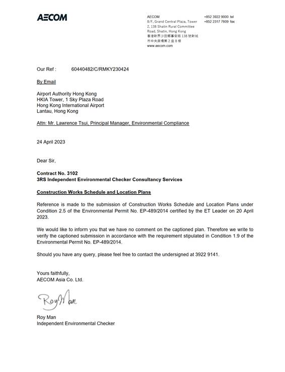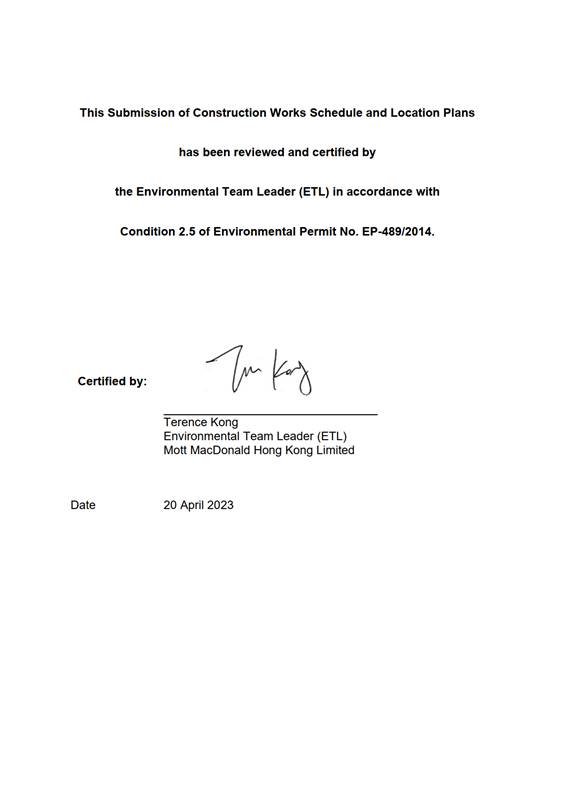 The first submission of Construction Works Schedule and Location Plans (CWSLP), in compliance with Condition 2.5 of the EP, was made to the Environmental Protection Department (EPD) on 18 September 2015, and finalized and released via the project’s dedicated website in October 2015. This updated submission is to include the latest status of the overall programme of construction works, the completion date of Horizontal Directional Drilling (HDD) works for the diversion of existing submarine aviation fuel pipeline, the completion date of the diversion of submarine cable, the latest information of land formation works, road networks and the associated airport facilities and utilities.