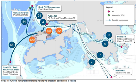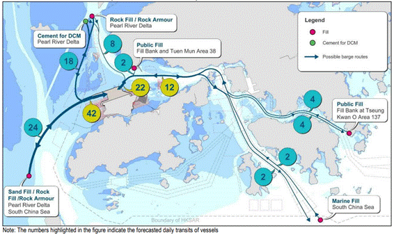 Vessels which deliver materials including for example sandfill, rockfill and prefabricated units are expected to pass through the Urmston Road Fairway and some CWD hotspots. If temporary material delivery vessels that have not been registered with AIS will require a guard boat with AIS installed to lead the way within the Works Area until the vessels station within the Works Area, otherwise, the vessels will not be allowed to enter the Works Area. In order to keep the construction-related vessels to a practical minimum, the site staff transportation vessel could be act as the guard boat during the transitional period. The Contractor shall ensure that the material delivery schedule is arranged where the site staff transportation vessel is able to lead the temporary material delivery vessel to the designated construction Works Area. A tight control on the marine travel routes will be implemented to minimise traveling routes within CWD hotspots.