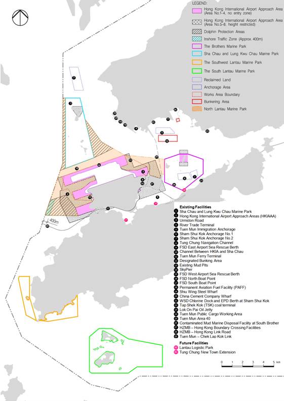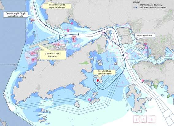 The purpose of the updated Marine Travel Routes and Management Plan for Construction and Associated Vessels (hereafter as the “Updated Plan”) is to align with the updated construction requirements and programme, and designation of North Lantau Marine Park (NLMP) with effect on 1 November 2024. At the time of submitting this Updated Plan, marine-based Deep Cement Mixing Works and filling operations of the reclamation works have been completed. General activities such as delivering site materials and construction equipment, manoeuvring and anchoring of working barges or vessels, transportation of site staff, and exportation of surplus fill and / or waste for disposal will continue. The plan ensures aviation and marine safety requirements during the commissioning of the 3RS and designation of NLMP.