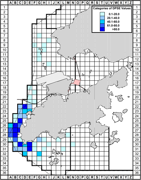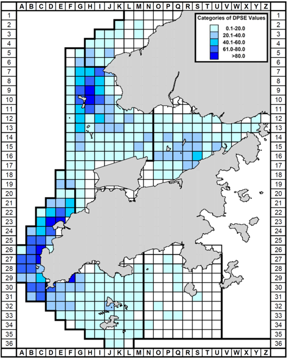 Figure 7-2: Historical density of Chinese White Dolphins with correct survey effort per km2 in waters around Lantau Island during 2001 – 2012 (numbers within grids represent “DPSE” = no. of dolphins per 100 units of survey effort; from Hung, 2014). In the dolphin habitat index developed for this plan, DPSE of 0.0 – 20.0 is rated as “Low”, 20.1 – 40.0 as “Medium” and 40.1 or above as “High”