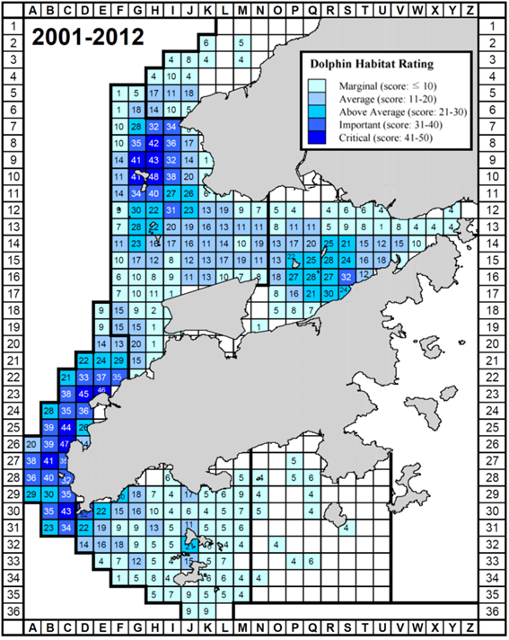 All of these four factors are based on dolphin numbers per unit effort, but including data on the four factors helps to ensure the analysis has broad temporal and biological relevance, and minimizes impacts of potential data anomalies from using just a single factor. A matrix of the relevant data was compiled. For each 1 x 1 km grid, there are four values presented, corresponding to the four factors listed above, and for each one evaluated as “Low”, “Medium” or “High” (note that these are subjective descriptive terms, though objective quantitative values for building the matrix were used). For densities (both current and historical), the corresponding values for “Low” were 0.0-20.0, 20.1-40.0 for “Medium”, and 40.1 or above for “High”. For habitat ratings, the corresponding values for “Low” were 0-10, 11-20 for “Medium”, and 21 or above for “High”. For 50% core areas, the corresponding values for “Low” were 0-10, 11-30 for “Medium”, and 31 or above for “High”. Relevant raw data are presented in detail in Hung (2014) and Hung (2023). The dolphin habitat index is then developed for each grid as shown in Figures 7-5a, 7-5b and 7-5c.