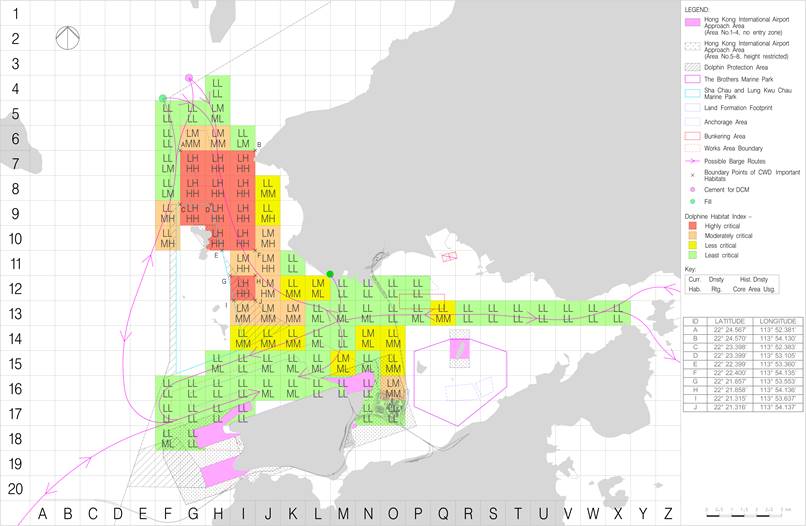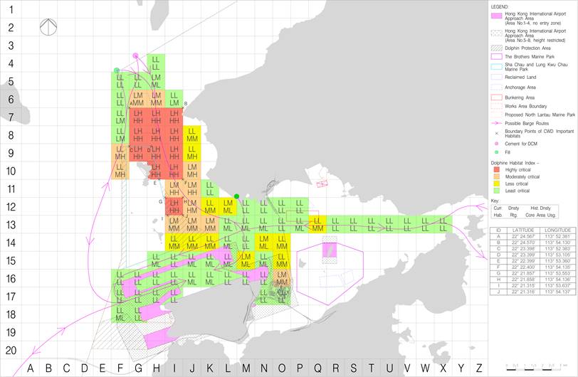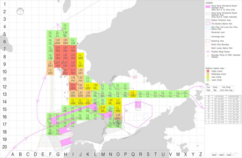 The resulting matrix (see Figures 7-5a, 7-5b and 7-5c) identifies highly critical areas of CWD habitat to the northeast of SCLKCMP which are delineated by boundary points A – J with GPS coordinates. Speed limits within these areas will be limited to 10 knots or less and this will be communicated to construction vessel captains during the skipper trainings. However, there may be exceptional cases that the 10-knot speed limit could be relaxed for contingency arrangements (e.g. during typhoon, adverse weather conditions) and for safety or emergency purposes.
